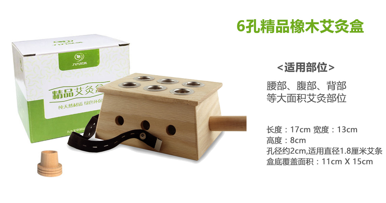 | [产品组成] | 六孔灸盒一个,松紧绑带一条,手柄一个,艾条灭火帽一个 |